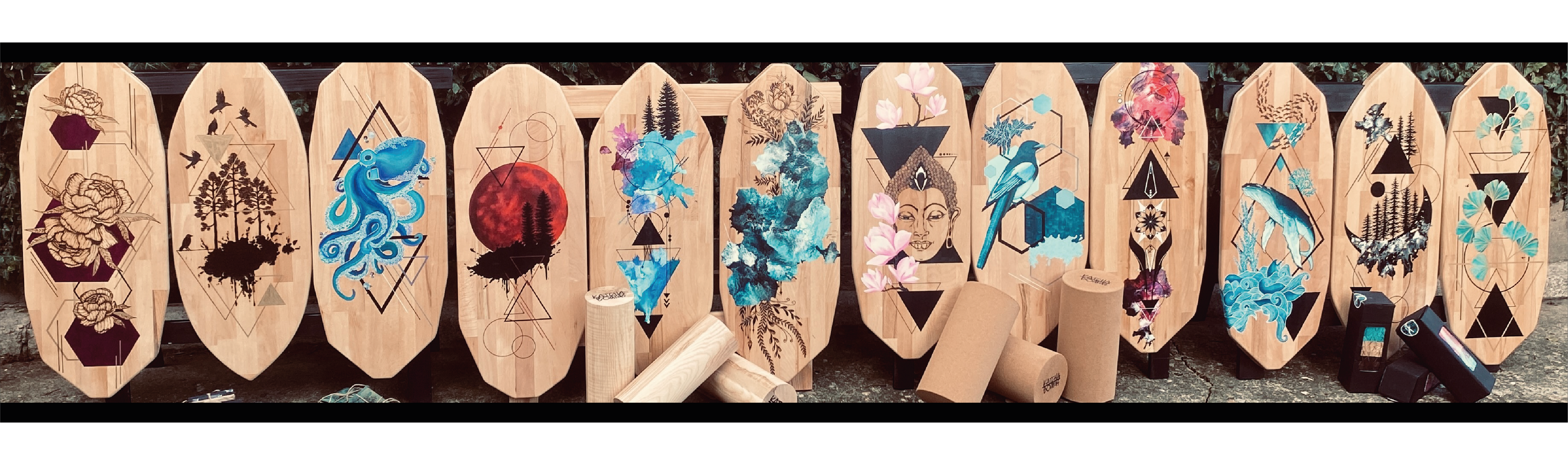 Každá balanční deska KatchaBoards vzniká celá ručně – od broušení a tvarování, přes malbu akrylem až po jemné linky pyrografie.