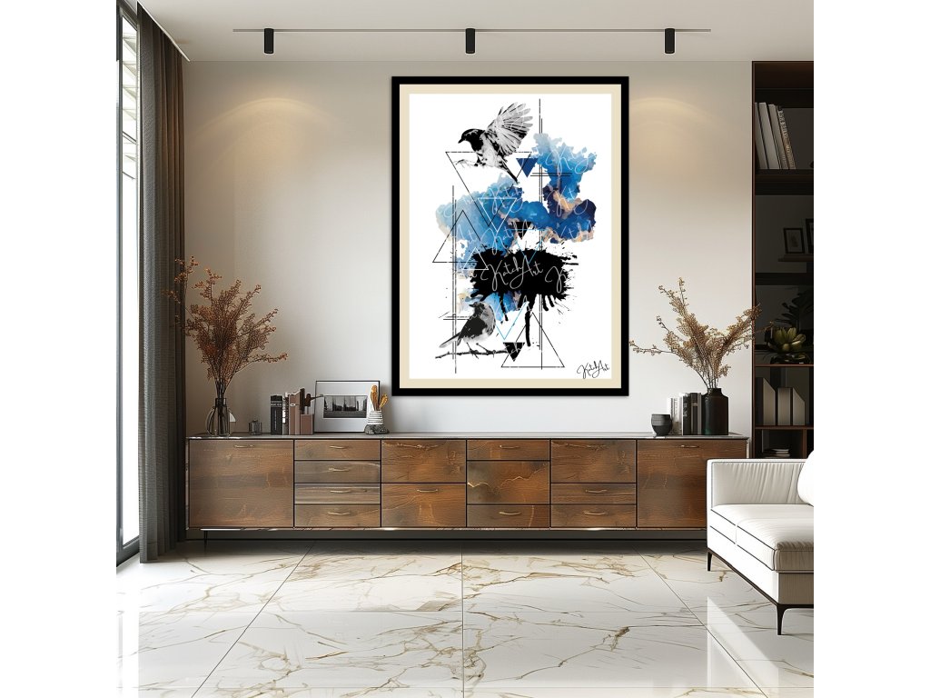 Obraz inspirován přírodou, zvířaty a geometrií. Zde se prolíná jemná modrá paleta s dynamikou opeřenců a typickými geometrickými prvky.