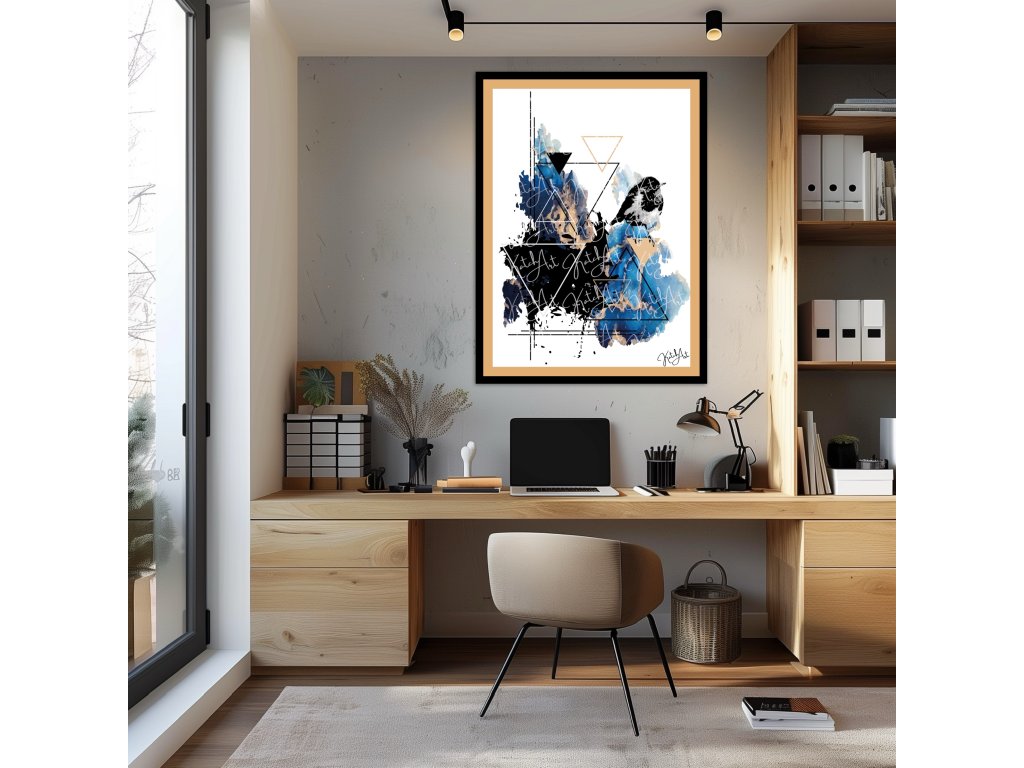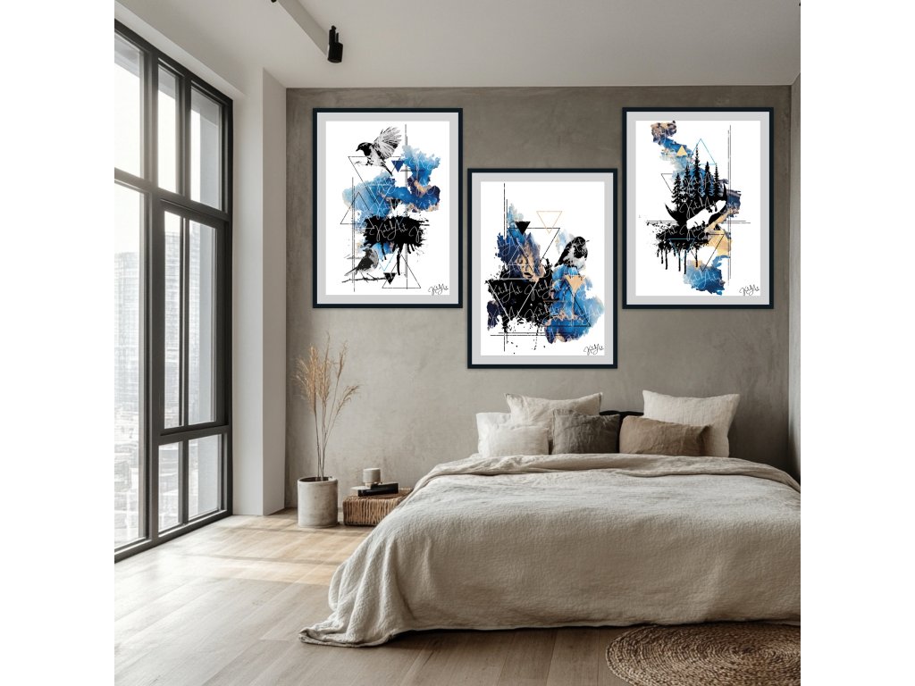 Obraz inspirován přírodou, zvířaty a geometrií. Zde se prolíná jemná modrá paleta s dynamikou opeřenců a typickými geometrickými prvky.