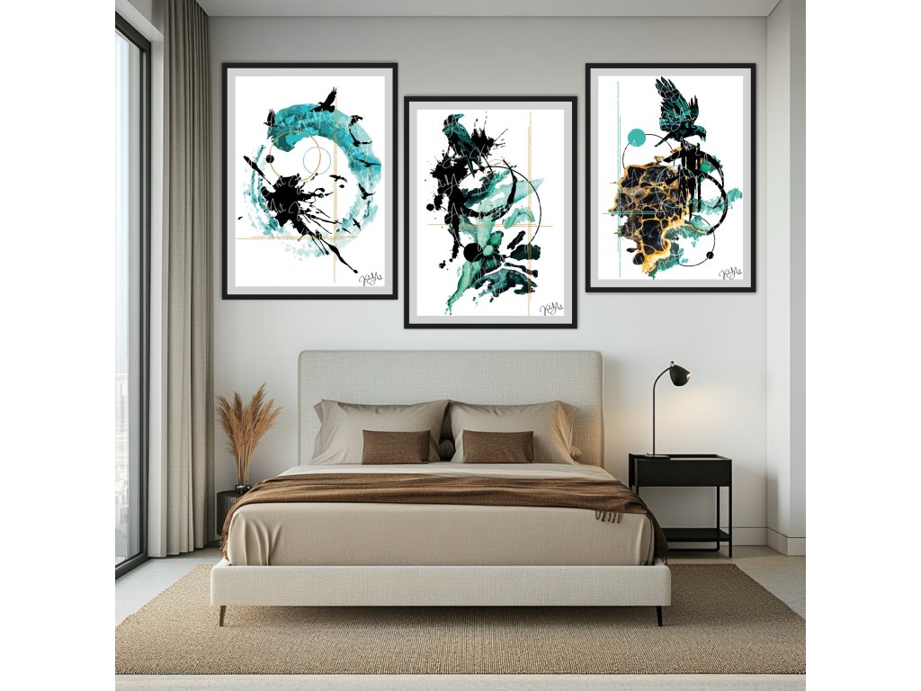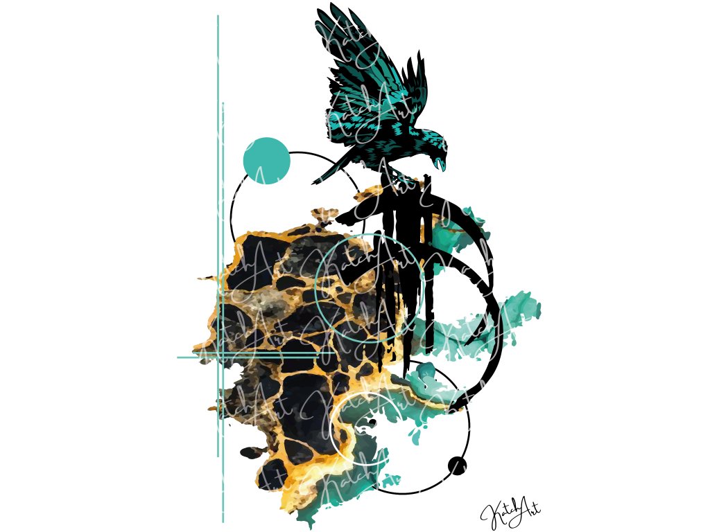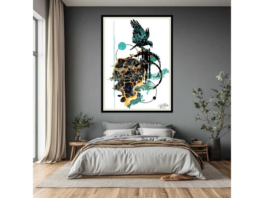Autorský print v digitální formě – výrazný motiv havrana, abstraktní tahy a živá energie barev.