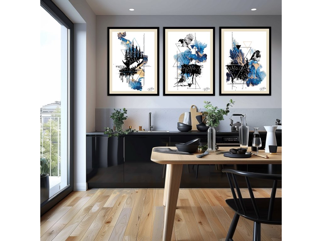 Obraz inspirován přírodou, zvířaty a geometrií. Zde se prolíná jemná modrá paleta s dynamikou opeřenců a typickými geometrickými prvky.