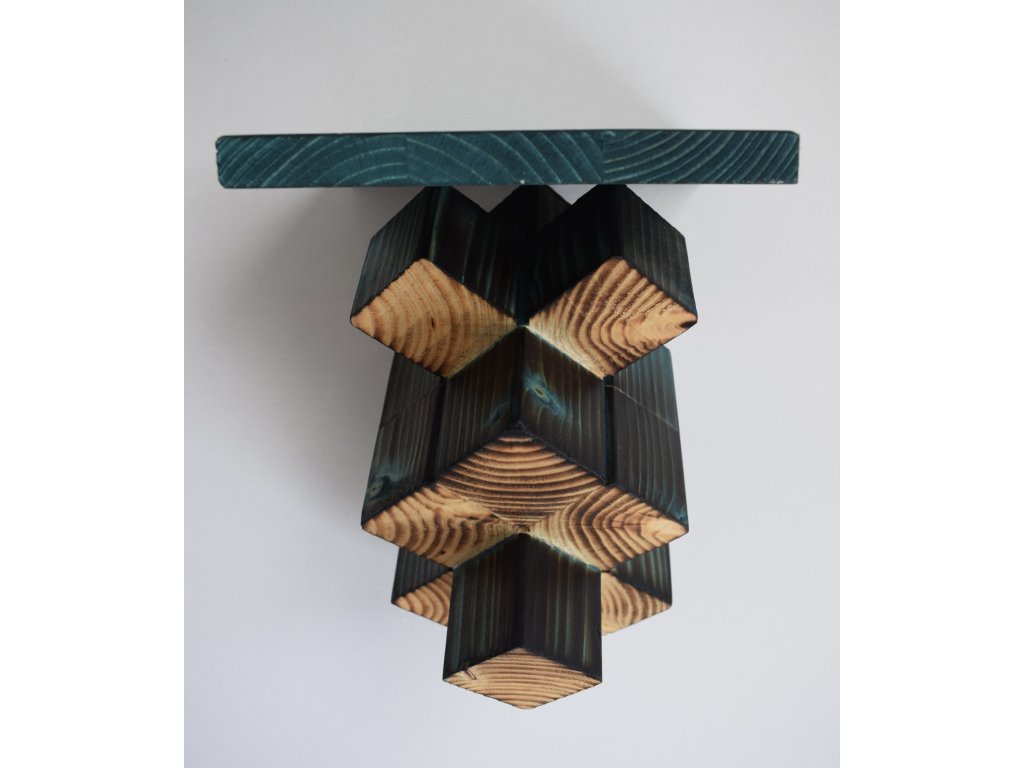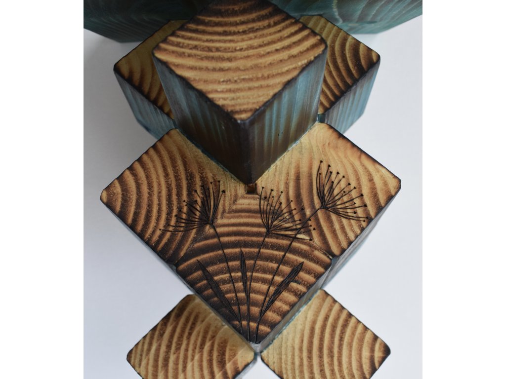 Originální ručně vyráběný stolek z opáleného smrkového nebo borovicového dřeva, ošetřený tyrkysovou lazurou, která zvýrazňuje přirozenou strukturu dřeva. Každý kus je jedinečný, s ručně vypalovanými detaily, které dodávají stolku osobitý charakter. Kombinace přírodního materiálu, geometrií inspirované konstrukce a moderního barevného akcentu vytváří výrazný designový prvek do interiéru. Stolek je stabilní, praktický a zároveň působí jako umělecký objekt – skvělý doplněk do vašeho domova, ateliéru nebo zahrady.