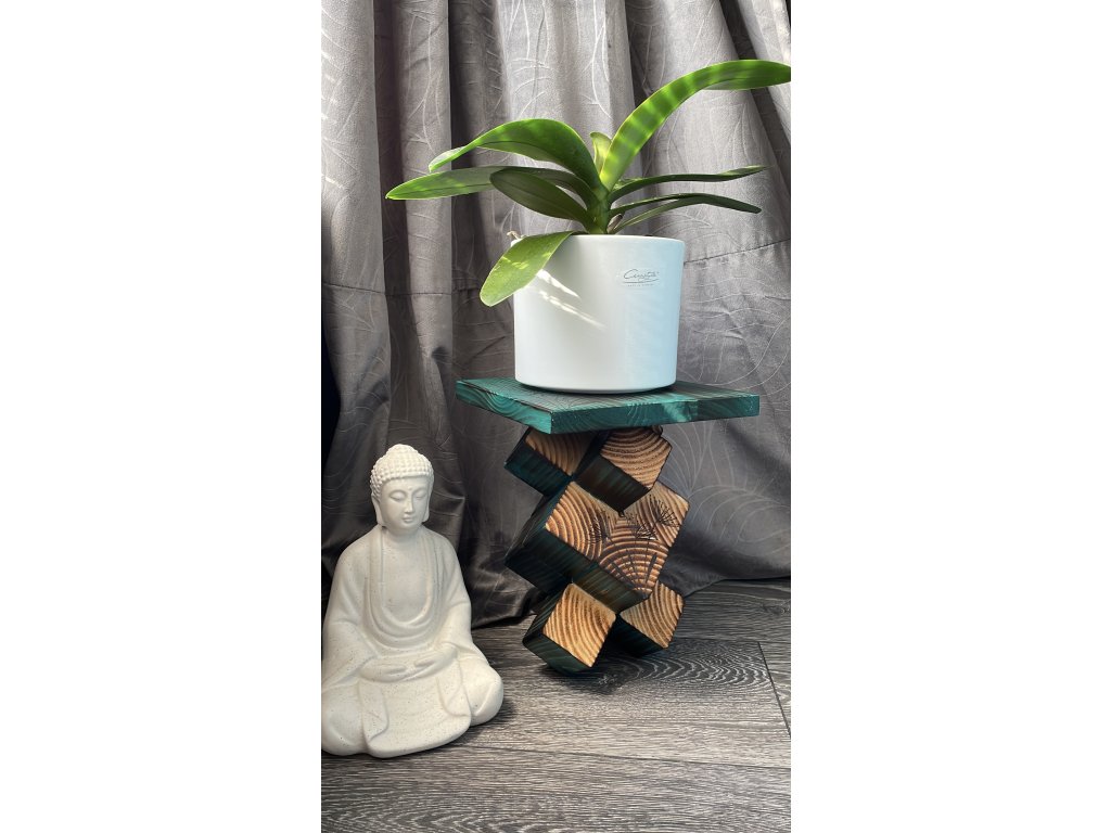 Originální ručně vyráběný stolek z opáleného smrkového nebo borovicového dřeva, ošetřený tyrkysovou lazurou, která zvýrazňuje přirozenou strukturu dřeva. Každý kus je jedinečný, s ručně vypalovanými detaily, které dodávají stolku osobitý charakter. Kombinace přírodního materiálu, geometrií inspirované konstrukce a moderního barevného akcentu vytváří výrazný designový prvek do interiéru i exteriéru. Stolek je stabilní, praktický a zároveň působí jako umělecký objekt – skvělý doplněk do vašeho domova, ateliéru nebo zahrady.