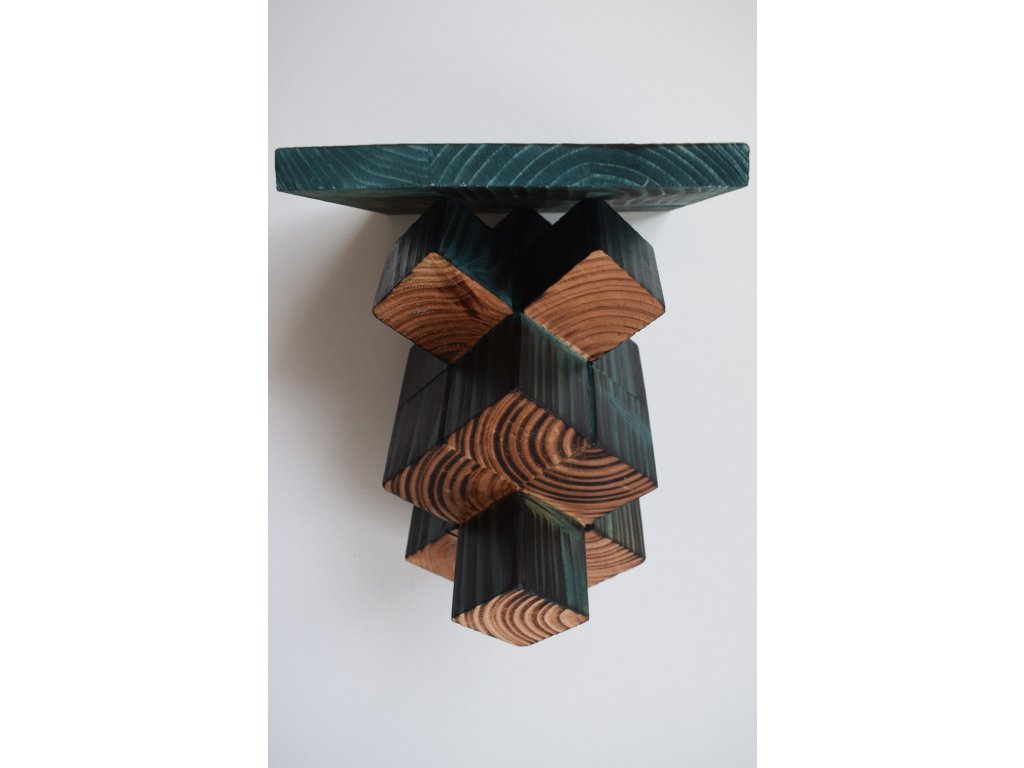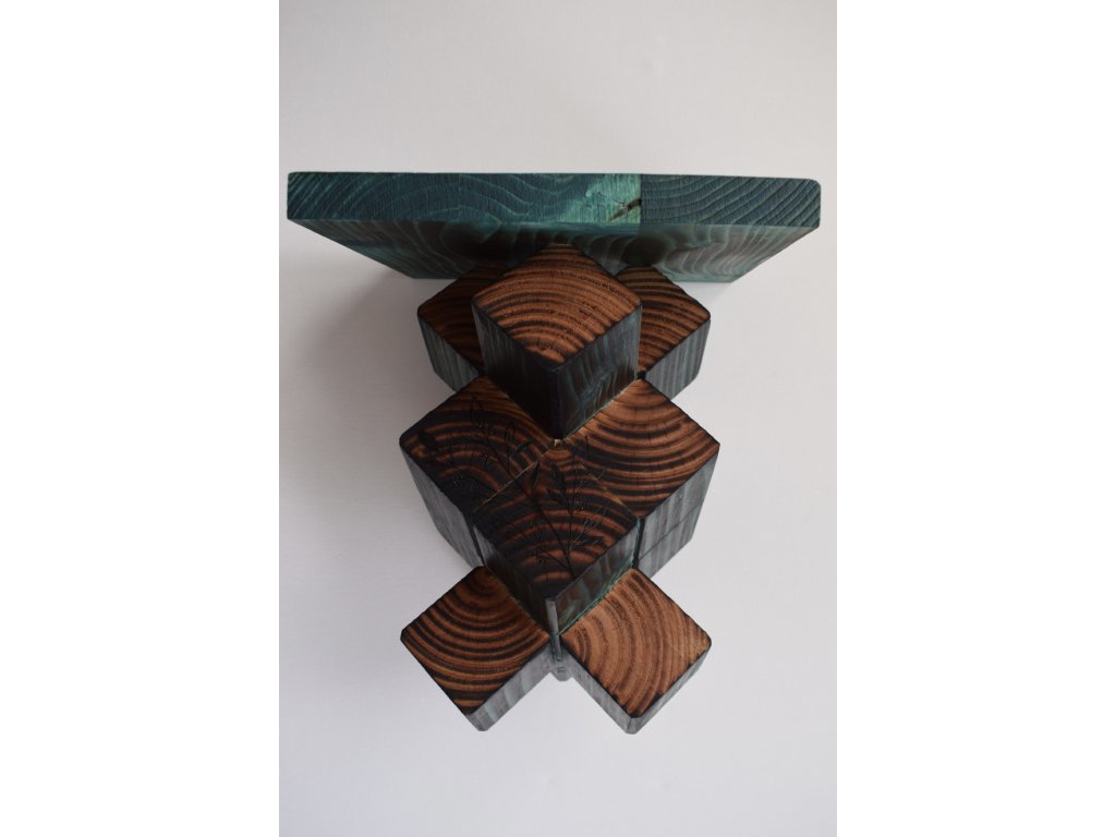 Originální ručně vyráběný stolek z opáleného smrkového nebo borovicového dřeva, ošetřený tyrkysovou lazurou, která zvýrazňuje přirozenou strukturu dřeva. Každý kus je jedinečný, s ručně vypalovanými detaily, které dodávají stolku osobitý charakter. Kombinace přírodního materiálu, geometrií inspirované konstrukce a moderního barevného akcentu vytváří výrazný designový prvek do interiéru. Stolek je stabilní, praktický a zároveň působí jako umělecký objekt – skvělý doplněk do vašeho domova, ateliéru nebo zahrady.