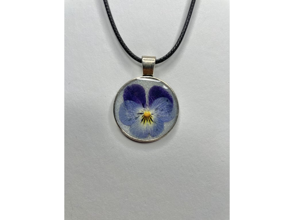 Ručně vyráběný epoxidový medailon s pravými květy macešek, zasazený do zlaté bižuterní slitiny. Originální šperk zavěšený na černé šňůrce.