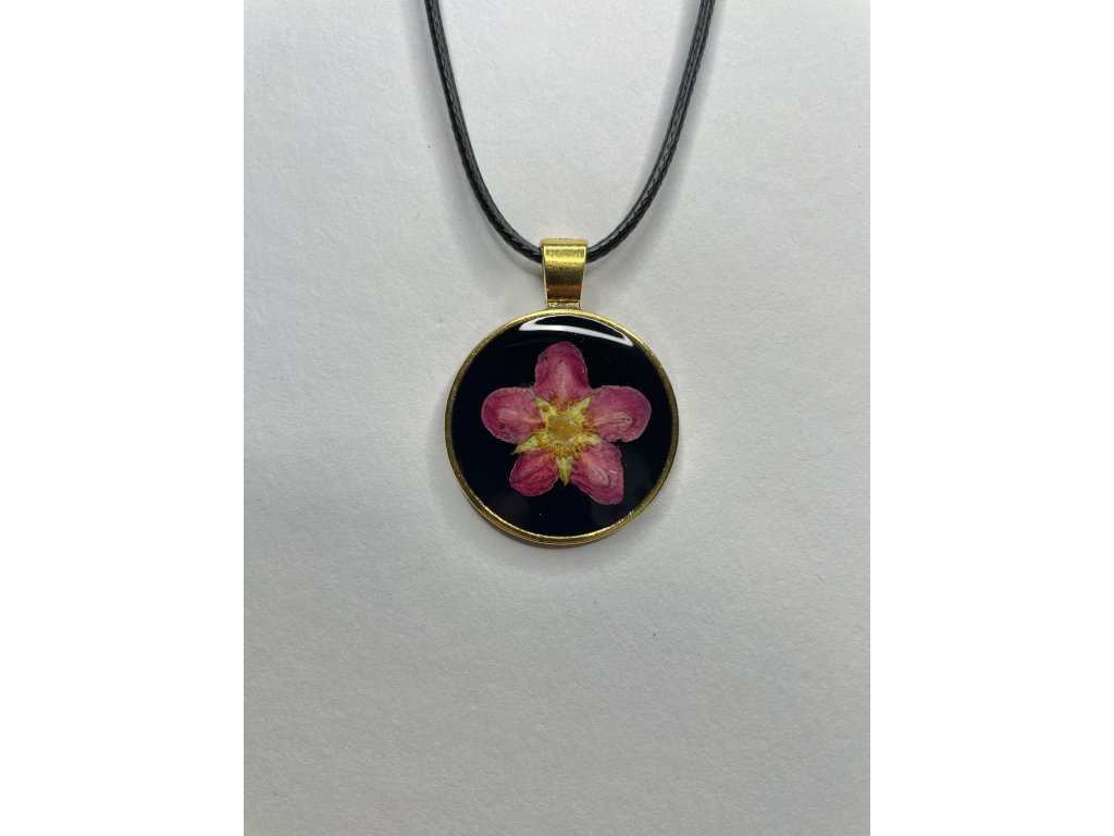Medailon je zasazený do bižuterní stříbrné slitiny. Nejedná se o chirurgickou ocel ani drahý kov, proto není vhodný pro extrémně citlivou pokožku. Každý kus je ručně vyráběný originál – kompozice květů, barev i podkladu se může lehce lišit.