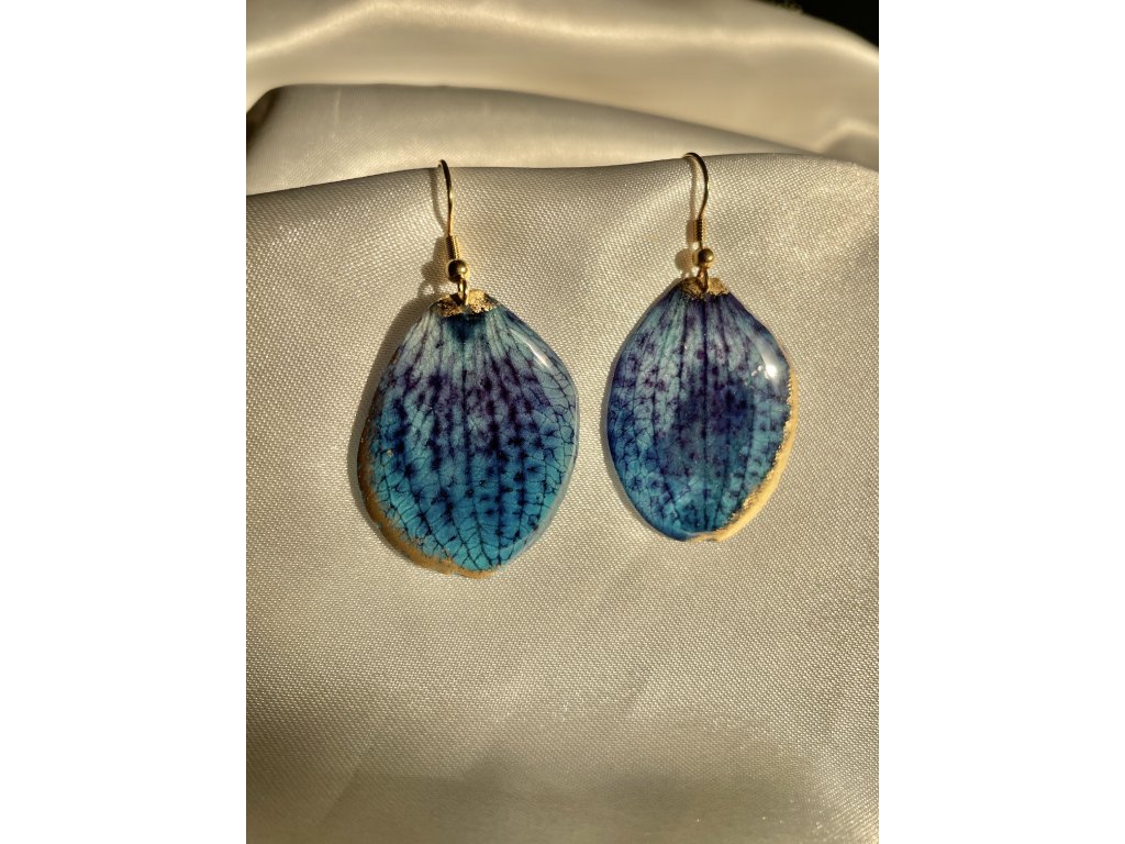 Jemné náušnice z modré orchideje, které spojují přírodní krásu s teplým zlatým tónem. Květy jsou zalité v čiré epoxidové pryskyřici, která je chrání a zároveň nechává vyniknout každý detail.