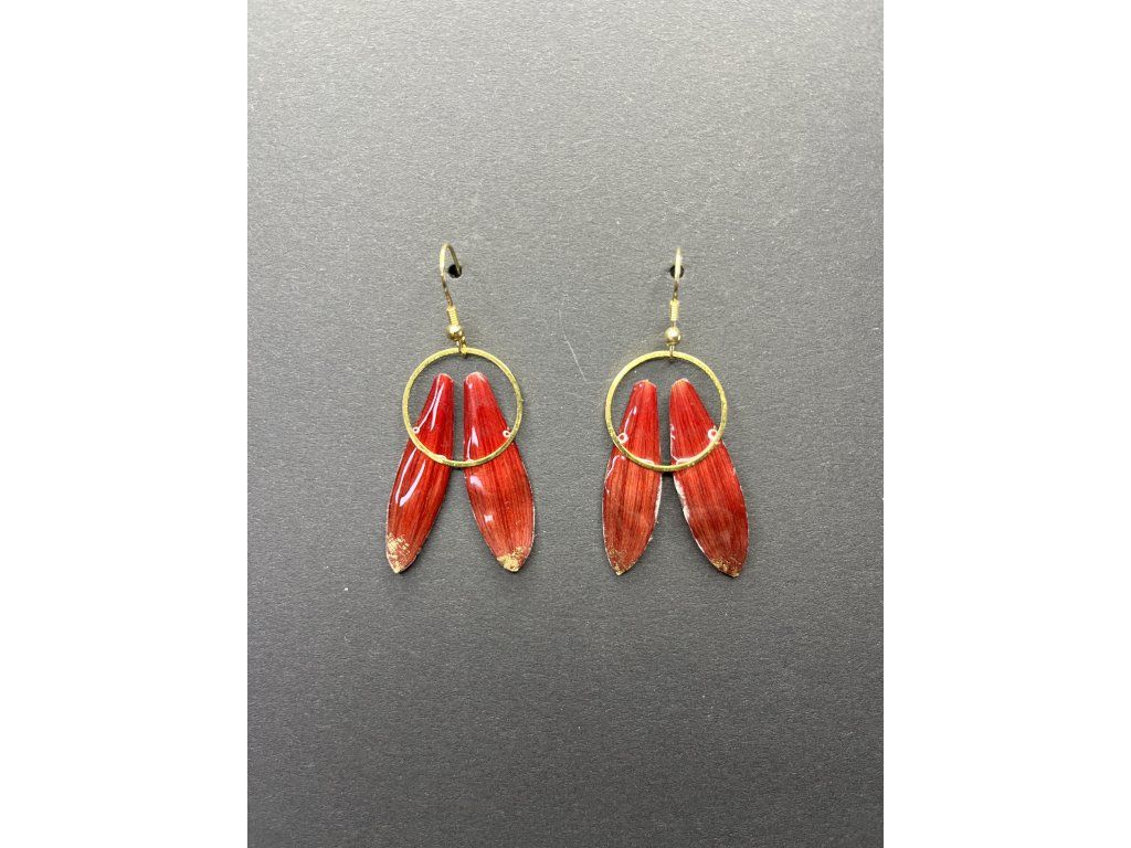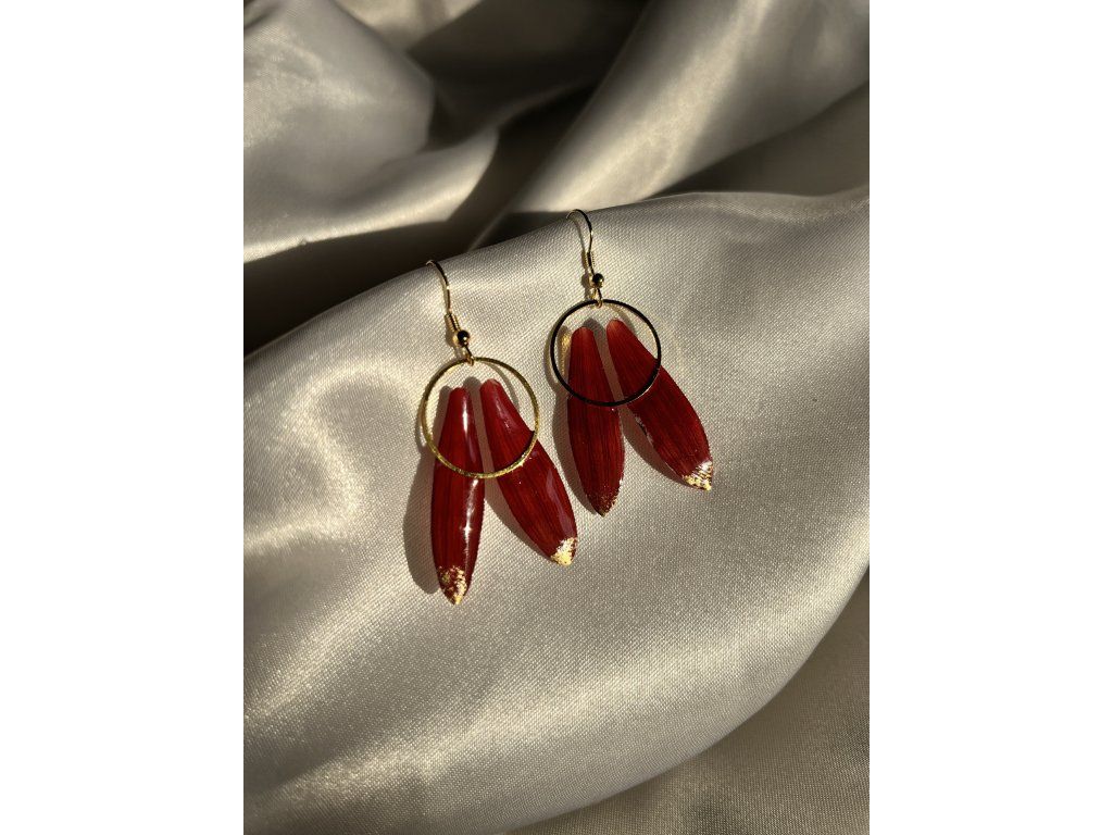 Každý pár je jedinečný – používám květy z přírody, z květinářství i od pěstitelů, včetně méně běžných a cizokrajných druhů. Náušnice mohou být doplněné o dřevo, akrylovou kresbu, zlaté plátky či prach nebo jemné ocelové prvky. Stylům ani barevným kombinacím se meze nekladou.